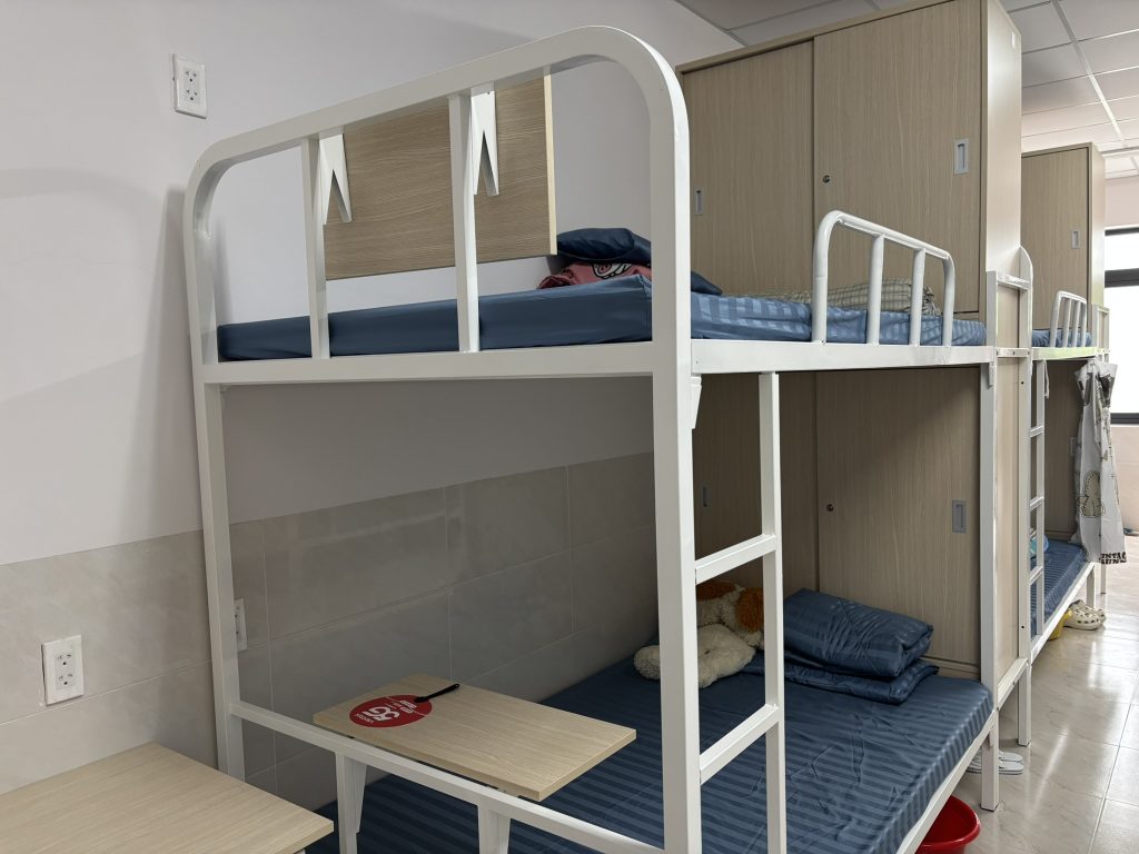 留学生の居室は、4人部屋です。居室内は、個別のベッド、机、荷物入れ、お手洗いなど簡素なものですが、新築で衛生的な環境で勉学に集中できます。